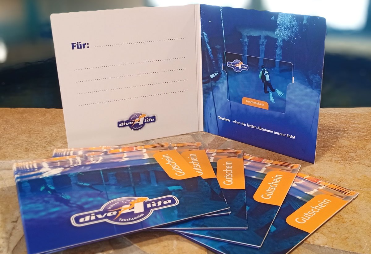 Onlineshop und erhältst ihn nach Zahlungseingang per E-Mail. Optional kannst du die dive4life Geschenkmappe per Post anfordern. Diese senden wir dir frei Haus per Briefpost zu.