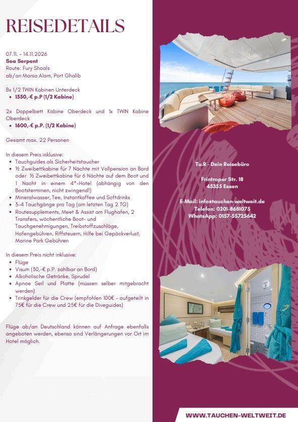 Im November 2026 führt es uns mit dem Reiseveranstalter - TUR - Tauchen und Reisen weltweit - auf Freediving Tauchsafari ins Rote Meer! Wir fahren mit der MY Sea Serpent.